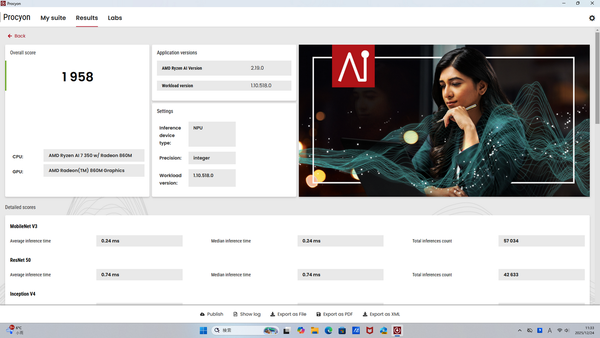 特筆すべきはAI処理能力だ。最大50TOPSのNPUを搭載しているだけに、「Procyon」のAIベンチマーク「AI Computer Vision Benchmark」のintegerは1958を記録した。
